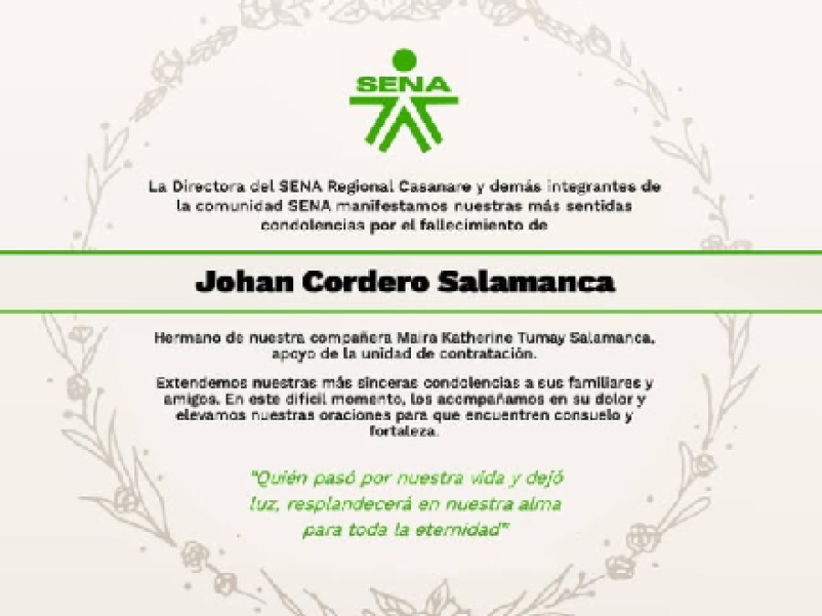 Tan pronto como se conoció de la noticia del óbito de Johan, la regional del Sena Casanare en cabeza de su directora Johana Medida, publicó un mensaje de solidaridad.