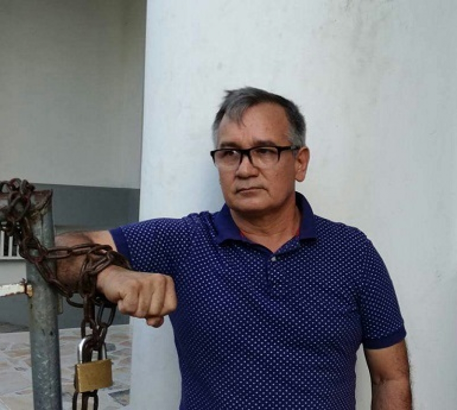 Encadenado a las afueras de las instalaciones de la empresa Ceiba permaneció por varias horas Ernesto Infante, líder del gremio de taxistas de Yopal quien exigía la renuncia de, Clarena López gerente de Ceiba.