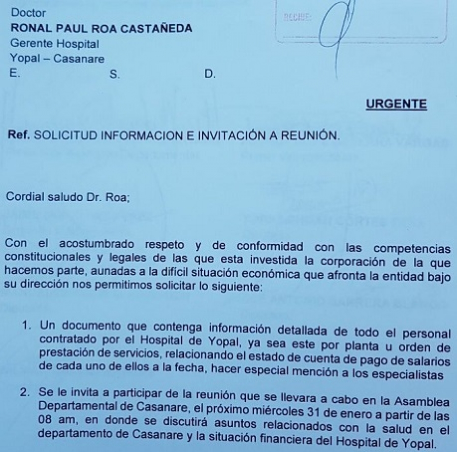 A la reunión fueron invitados el secretario de Salud, David Francisco Gallego Moreno, el director del Departamento Administrativo de Planeación, Humberto Alirio Martínez Pérez, directivos de Hospital Regional de la Orinoquía E.S.E, Capresoca y de Red Salud.