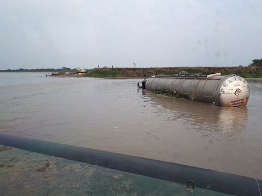 Tracto camión que quedó atollado en el muelle conocido como Puerto Borracho del rio Meta, jurisdicción de la Primavera, Vichada, le han logrado extraer con otro tracto camión, alrededor del 80% del aceite de palma que iba a ser transportado hacia la ciudad de Villavicencio, relató el capitán de Infantería de Marina, Andrés Ladino.