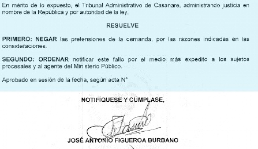 Por lo anterior negó la perdida de investidura para los concejales demandados Fabio Castro, Freddy Elías Corredor, Wilmer Andrade Leal, Rodrigo Pérez, Fabio Suárez, Roland Wilchez, Blanca Nury Barrera, Jhon Morales, Neil Bottia, Nelson Figueroa, Tito Laverde, Ruber Chaparro y Ricardo Salamanca, elegidos para el periodo 2012-2015.