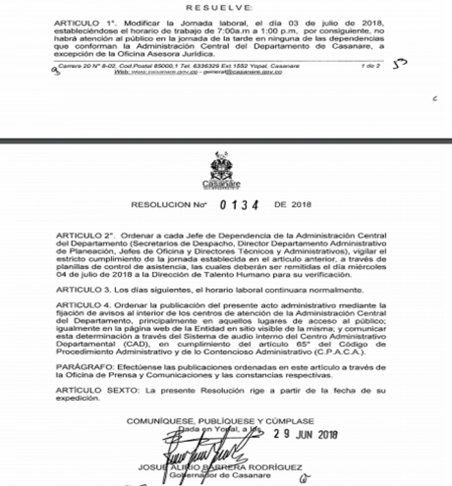 Cambio de horario anuncia la Gobernación de Casanare, para el próximo martes 3 de julio, día que atenderá al público desde las 7 a.m. hasta la 1 p.m. Este cambio se estableció mediante resolución 134 del 2018 y en concordancia a la circular 100/2018 del Departamento Administrativo de la Función Pública, que garantiza la flexibilidad de horario laboral de los servidores para que puedan presenciar y compartir en familia el partido de la Selección Colombia.