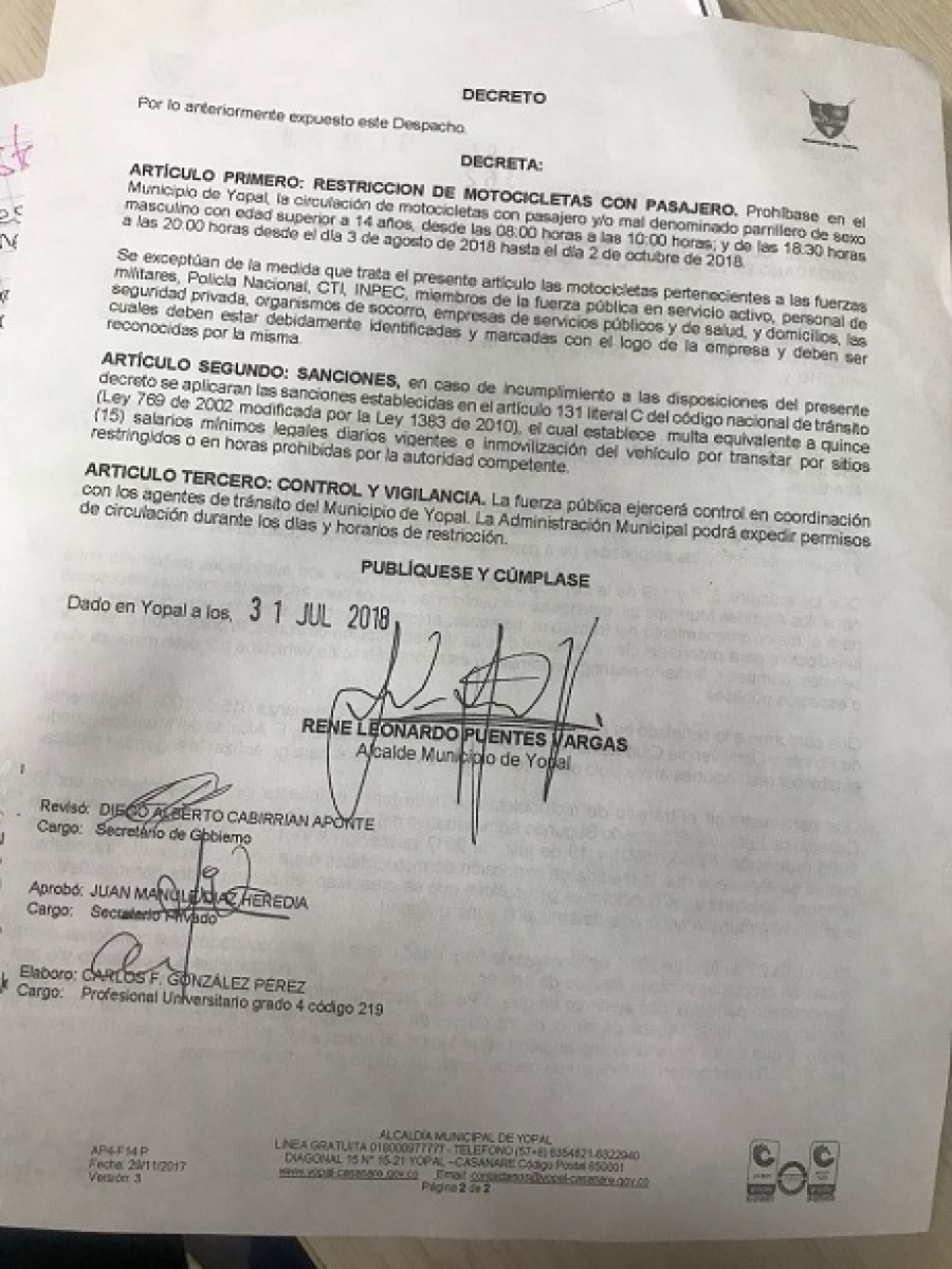En un decreto emitido por la Alcaldía de Yopal, se adoptará la restricción de motocicletas con pasajero hombre mayor de 14 años de edad, a partir del 3 de agosto hasta el 2 de octubre en los horarios de 8:00 a 10:00 am y 6:30 a 8:00 pm.