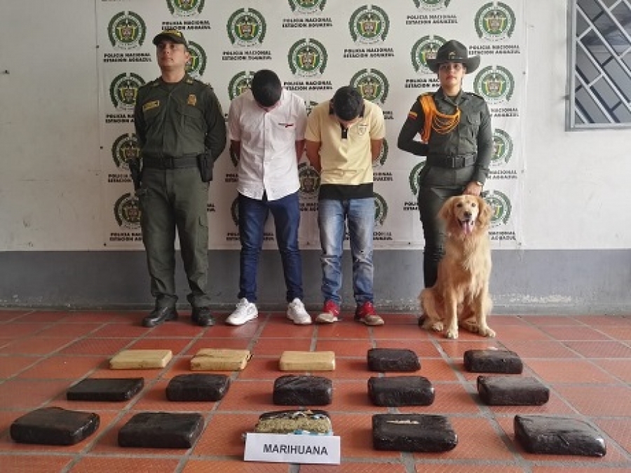 El olfato de Pipe, un perro antinarcóticos del grupo de carabineros de la Policía, detectó 16 kilos de marihuana que eran transportados por dos hombres de 23 y 26 años, en un bus de servicio público con destino a Yopal.