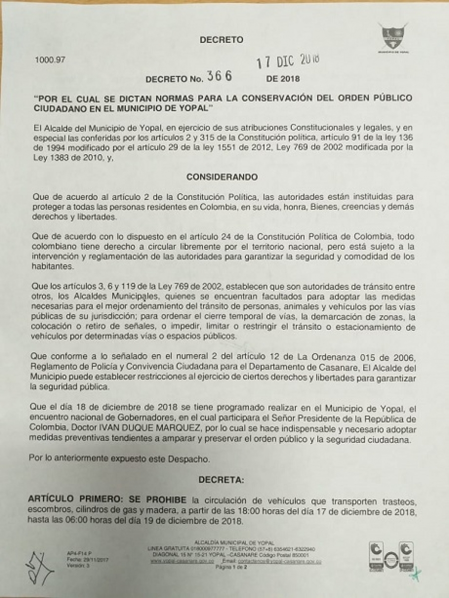Hasta mañana 19 de diciembre a las 6:00 am está prohibida la circulación de vehículos que transporten trasteos, escombros, cilindros de gas y madera, de acuerdo al decreto n. 366 emitido por la Secretaría de Gobierno de Yopal.