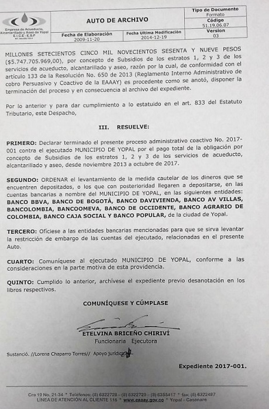Superada la totalidad de la obligación de 5.747 millones de pesos, que dio origen a este proceso administrativo, la Empresa emitió un auto de archivo para declarar terminado el proceso 2017-001 que embargaba las cuentas bancarias a nombre de la Alcaldía de Yopal. La decisión ya fue notificada tanto a la Administración Municipal, como a las entidades financieras respectivas.
