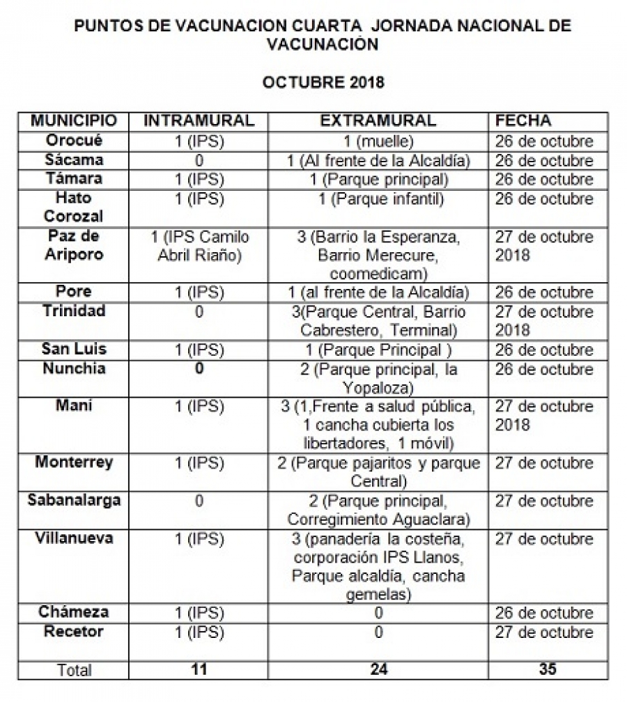 Red Salud Casanare E.S.E se une a la 4ta Jornada Nacional de Vacunación, para la cual se invita a la población Casanareña a que asista a los puntos de atención en los diferentes municipios, los días 26 y 27 de octubre 2018, en el horario de 8:00 a.m. a 4:00 p.m.