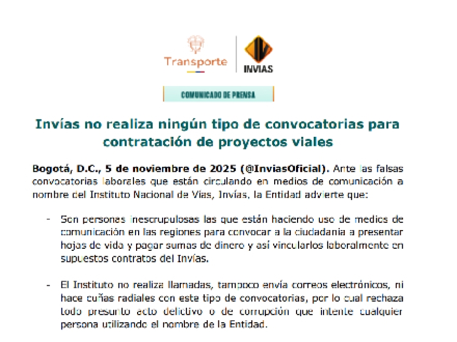Además, Invías advirtió que ningún funcionario de la entidad está autorizado para ofrecer empleos, realizar vinculaciones ni exigir pagos en el marco de convocatorias.